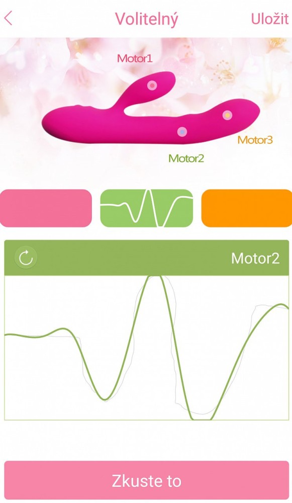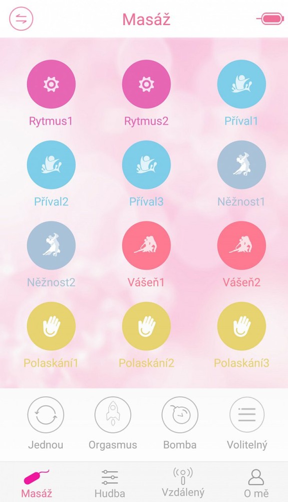 Se va deschide panoul principal sub secțiunea de masaj cu 12 tipuri de vibrații. Sub meniul de vibrații veți găsi un meniu cu 4 programe (repetiție, orgasm, bombă și opțional).